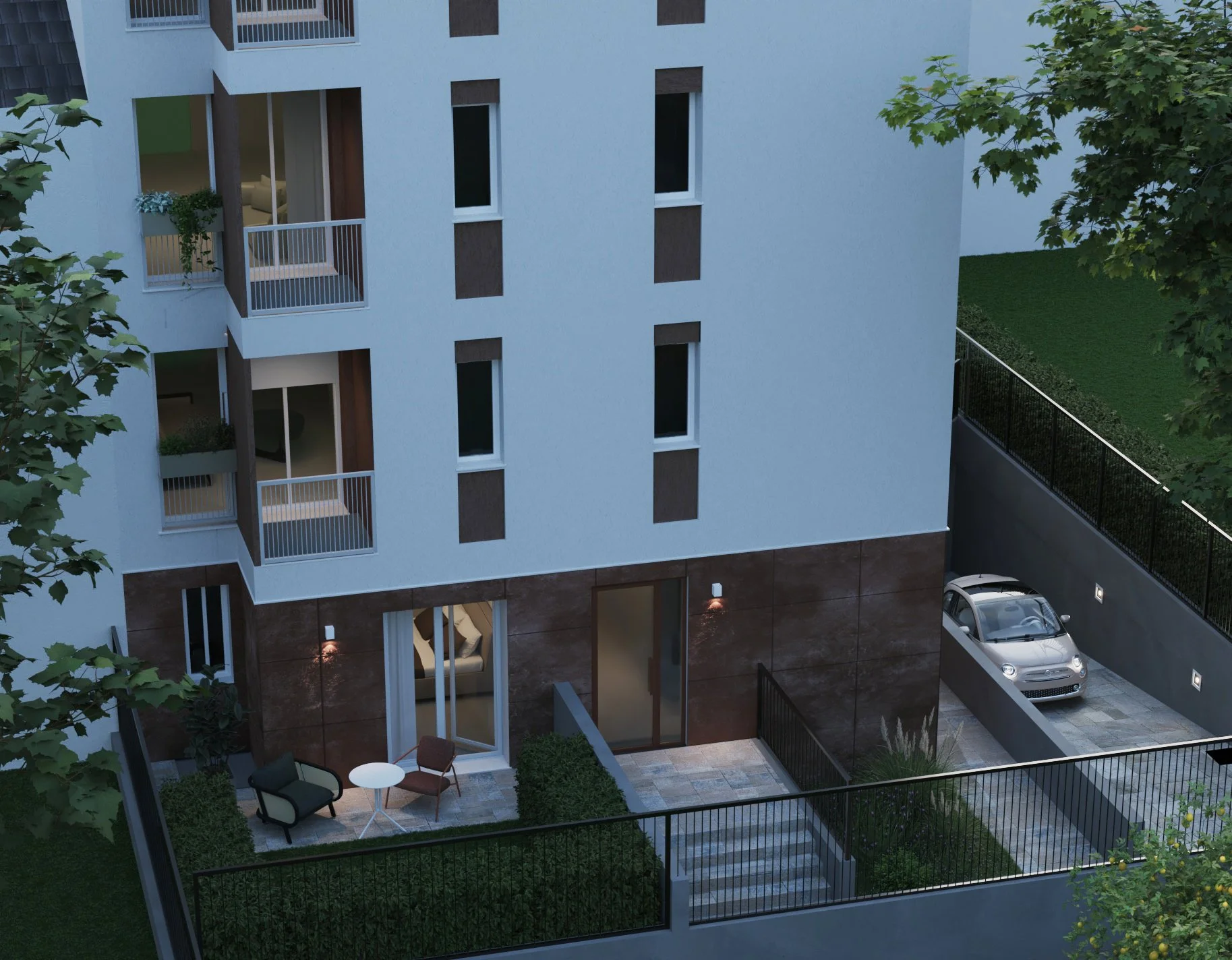 La progettazione privilegia la qualità dell’abitare, con spazi ben distribuiti e un rapporto diretto con le aree verdi che circondano l’edificio. Il complesso è inserito all’interno di una proprietà privata, dotata di parcheggi riservati, garantendo comfort, privacy e funzionalità.